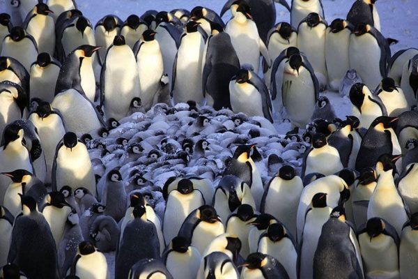 21. Pingüinos. Se agrupan en formación tortug para mantener calientes a las crías hasta que estén preparados por el frío polar.
