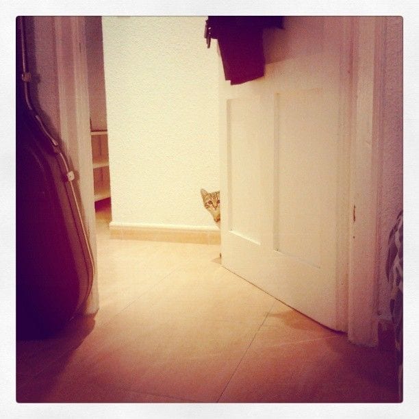 Seguramente anda en algo, porque si algo podemos decir de los gatos, es que son inteligentes, manipuladores y siempre están tramando algo, así que esa cara tímida tras la puerta créeme que esconde algo.