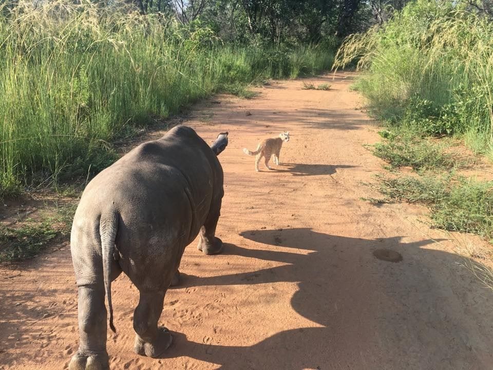 Esta pequeña felina, Mewie, fue rescatado cuando tenía solo unas semanas de edad por Jamie Traynor, un cuidador de los rinocerontes huérfanos, mientras que Nandi, la pequeña rinoceronte, tenía sólo 2 meses de edad cuando fue encontrada perdida, andando sola