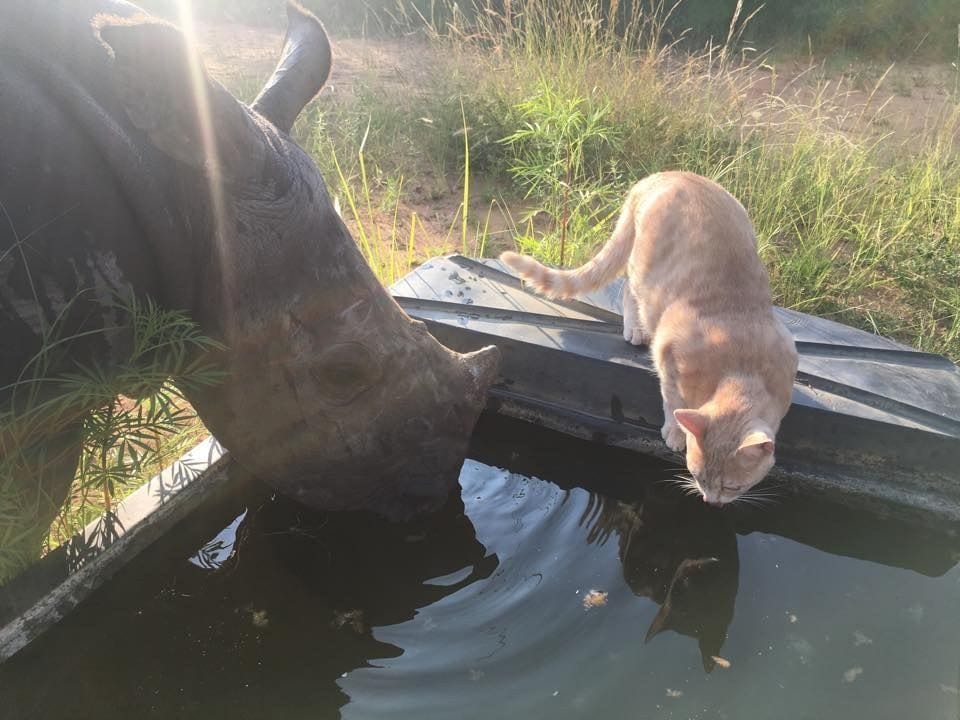 No sabemos porqué esta gatita naranja atigrada, decidió hacerse amiga de este rinoceronte huérfano, pero seguro que en su pequeño cuerpo cabe cien veces más amor que en el de los cazadores furtivos.