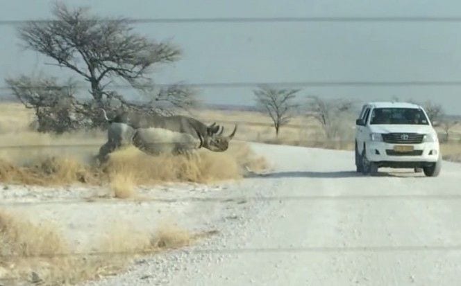 Mientras que el grupo de turistas permanecía dentro de un jeep en el Parque Nacional de Etosha (Namibia), el rinoceronte embistió un par de veces el vehículo en señal clara de desacuerdo.