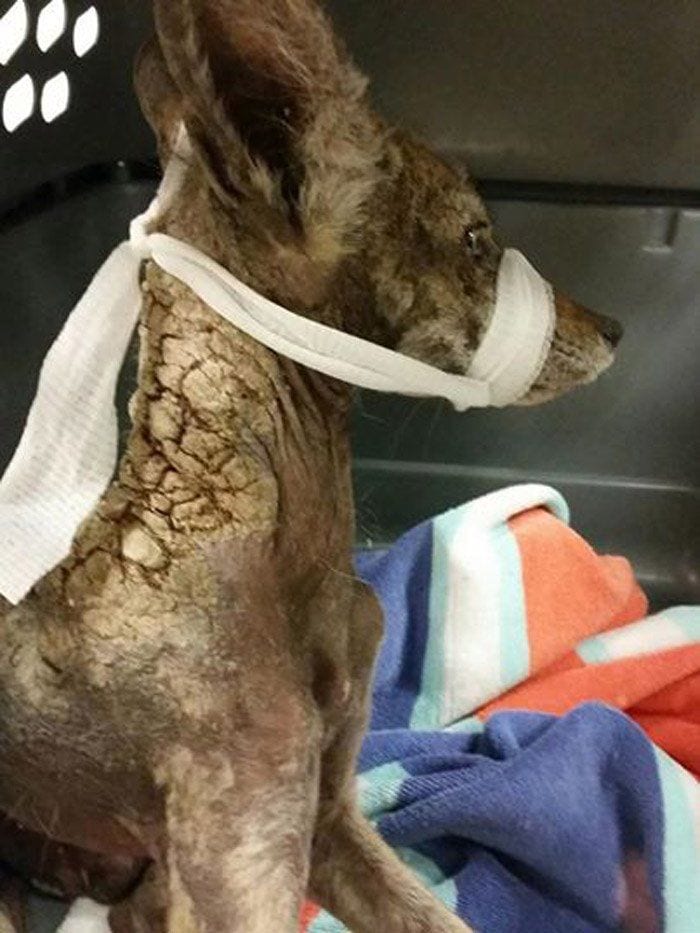 El animal fue transportado al centro de rescate de vida salvaje Gold Country Wildlife Rescue (GCWR) en Loomis, California. Allí se le administró el debido tratamiento para su caso de sarna crónica, que causa pérdida de cabello, picor e irritación cutánea. Además, la joven coyote se encontraban en estado de deshidratación.
